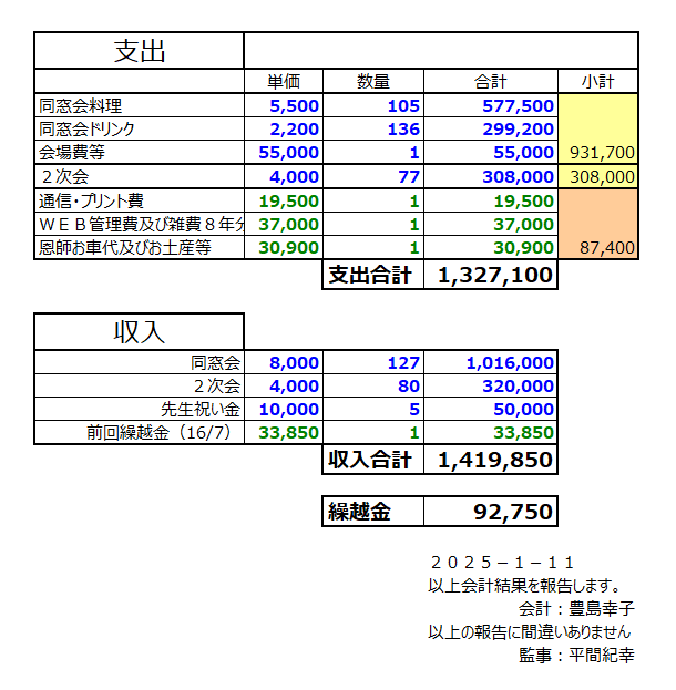 2025年1月11日 代表幹事 手嶋 博 会計担当 豊島幸子 監事 平間紀幸